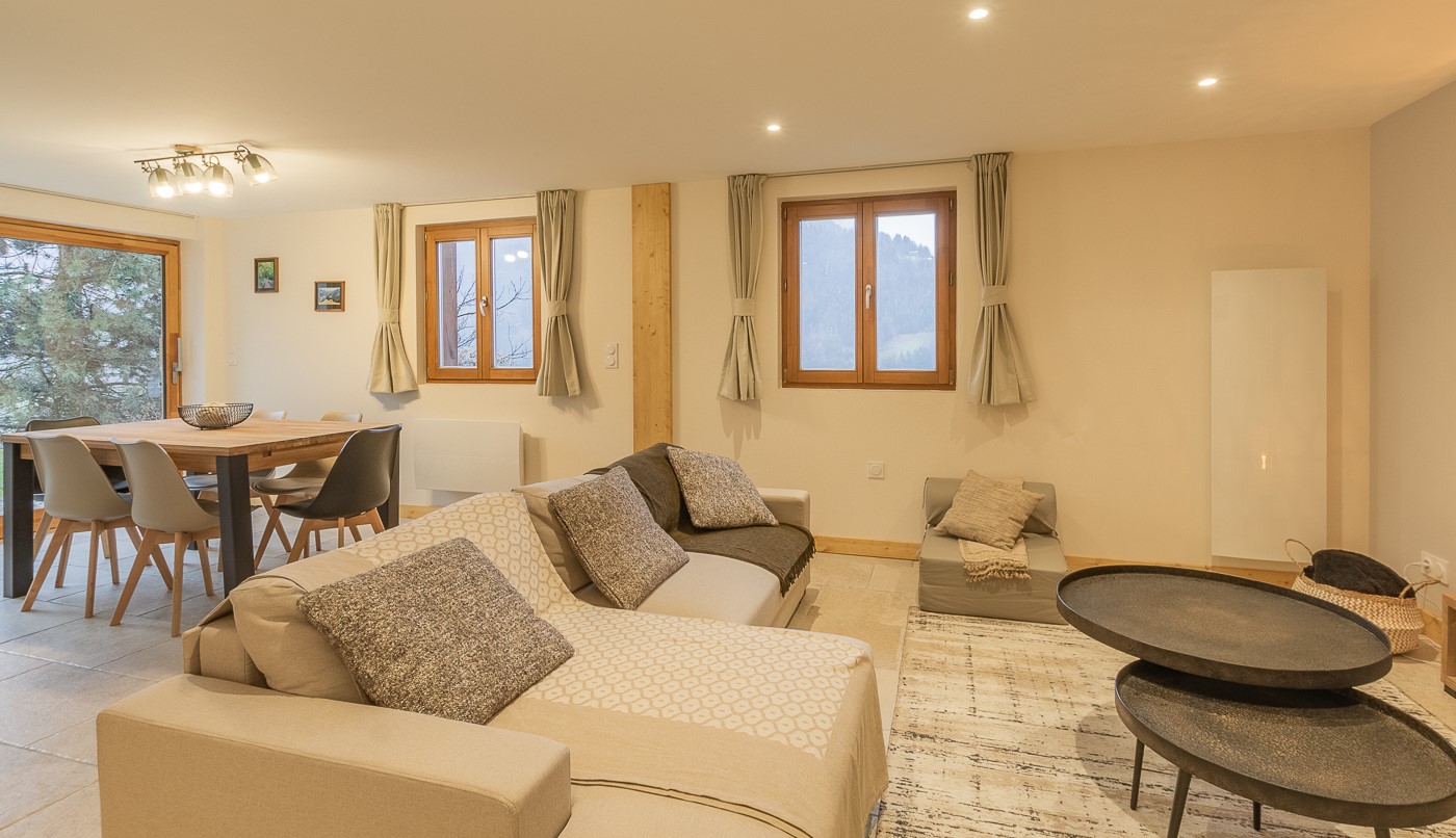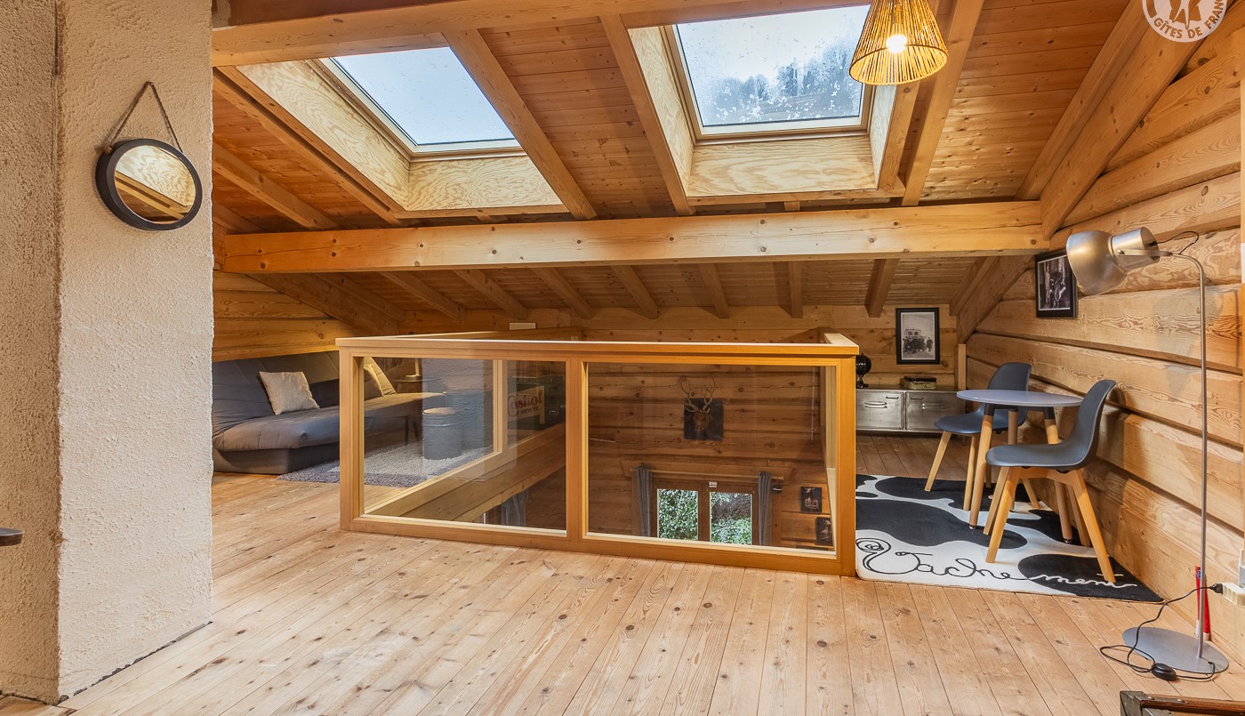 Notre gîte indépendant est équipé comme une véritable maison familiale. Les espaces intérieurs sont soigneusement décorés de beau mobilier en bois massif. Les balcons aériens orientés plein sud, offrent une vue fabuleuse sur le clocher de l'église et le Mont Mirantin.